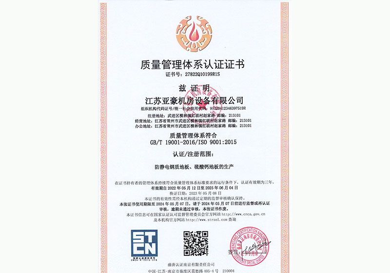 江蘇亞豪機(jī)房設(shè)備有限公司創(chuàng)建于2015年,坐落在蘇錫常中心地帶,是一家專業(yè)活動(dòng)地板制造商,集設(shè)計(jì)、制造、銷售、安裝一體并通過ISO9001質(zhì)量管理體系認(rèn)證。